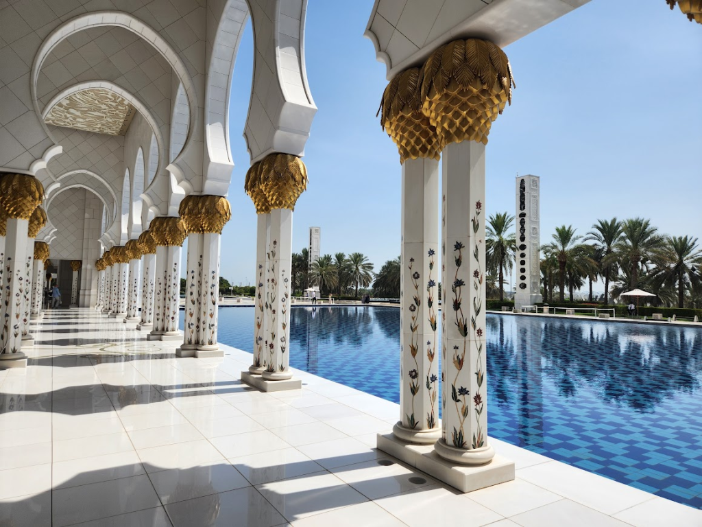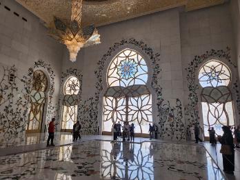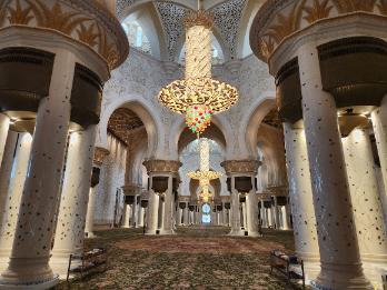 Másnap első állomásunk a híres Sejk Zájed mecset volt. A Nagymecset hozzávetőleg 22 412 négyzetméteres területen fekszik. Ez körülbelül 4-5 focipályányi nagyság, tehát valóban hatalmas komplexumról van szó. A teljes terület a belső udvart, imacsarnokokat, oszlopsorokat és víztükröket is magában foglalja. Az udvar például önmagában is az egyik legnagyobb márvánnyal borított kültéri felület a világon. A mélygarázsból először egy hatalmas fogadó térbe érkezünk, üzletekkel szegélyezve. Minden felület csillog-villog. Férfiakra és nőkre is szigorú öltözködési szabályok vonatkoznak. Na jó, a férfiakra nem annyira…