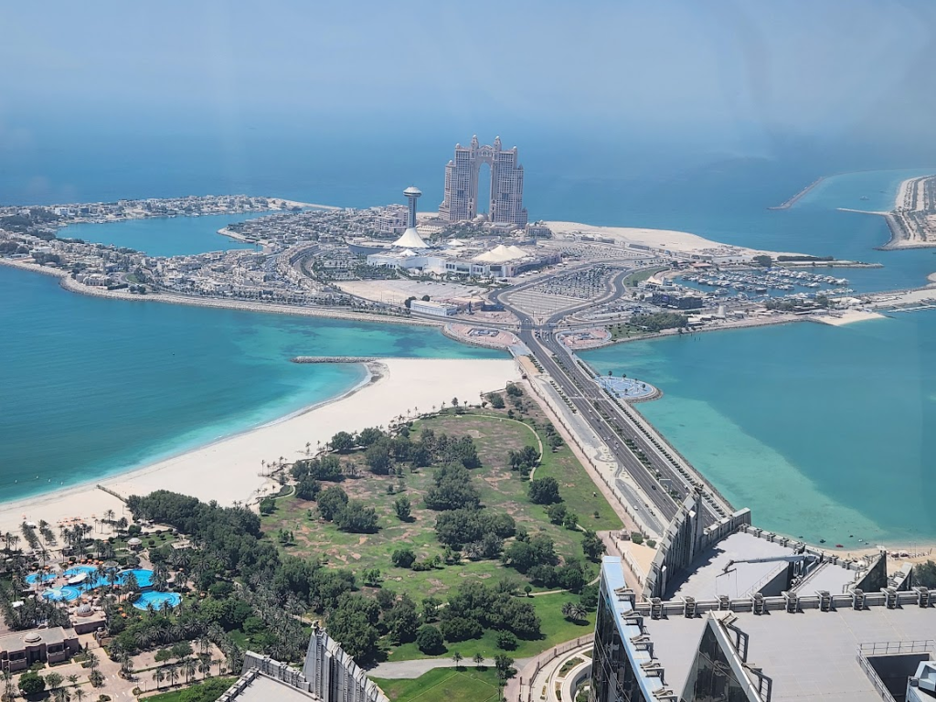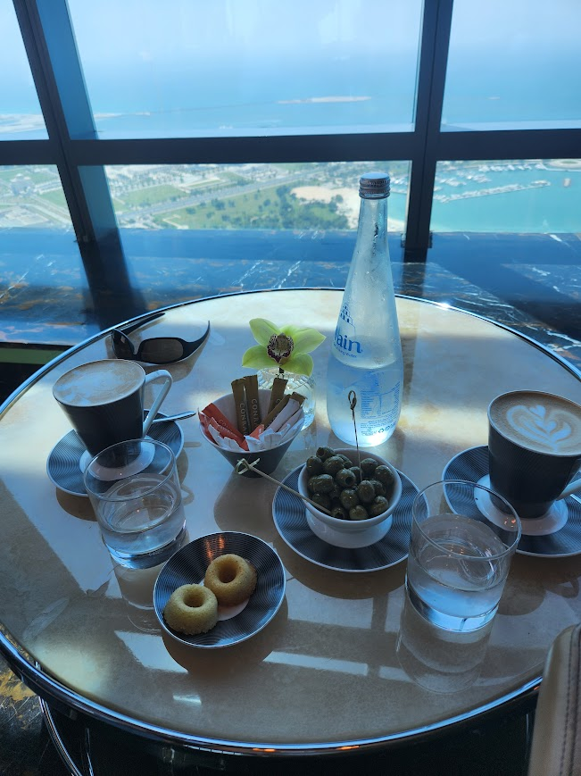 A 2-es toronyban van az Observation Deck – 300 méter magasan egy kávéval a kezedben bámulhatod a várost. Pontosan ezt tettük. A belépőjegy 95 AED (9500 Ft), aminek a nagyrésze levásárolható. Mi egy-egy kávét kértünk, plusz egy ásványvizet és csak 10 AED-et kellett ráfizetni. Ráadásul a kávé mellé (vagy lehet, hogy mindenhez) járt egy kis tál olivabogyó és egy-egy falat sütemény.