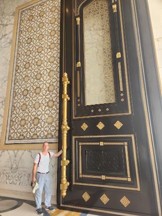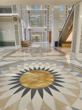 Minden arany, fehér és kék, hatalmas terek, geometrikus minták, óriási csillárok. Egyszerűen nem tudtunk betelni vele, nem is tudom, hány tucat fotót csináltunk. Nekem nagyon tetszett, hogy igaz minden díszes, de ugyanakkor finom, harmonikus az összkép, nem éreztem „too much”-nak.