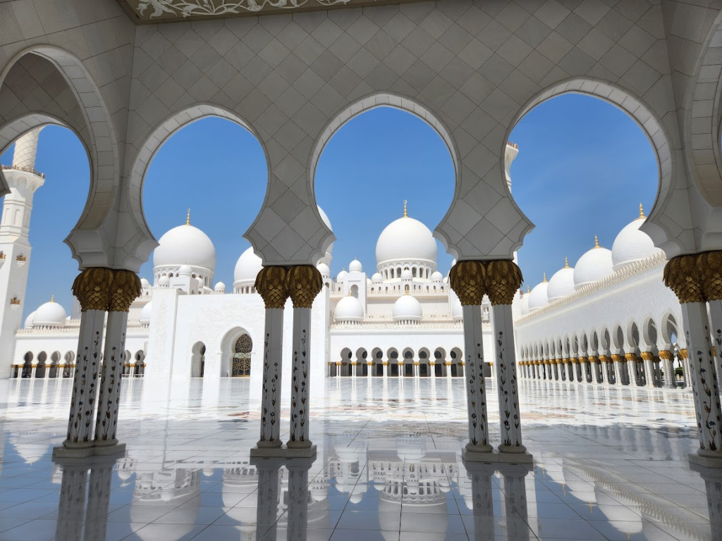 - 82 hófehér kupola, 4 karcsú minaret (mindegyik 107 méter magas), és elképesztően részletgazdag márványdekoráció.