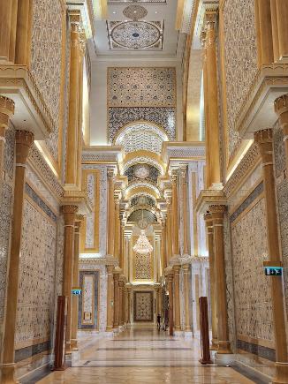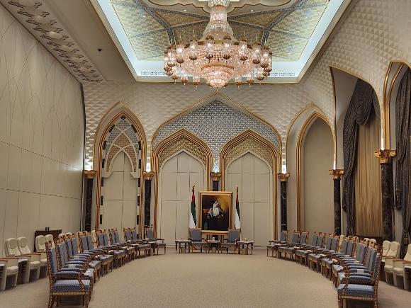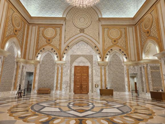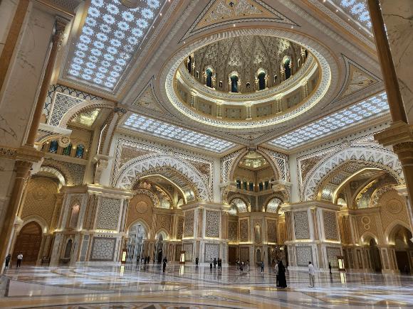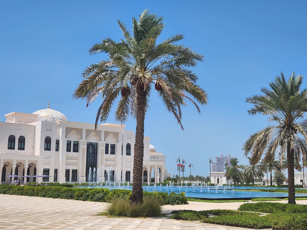 Innen irány az Elnöki Palota (Qasr Al Watan), a nyolcadik legnagyobb mecset a világon. Nevét Zájed bin Szultán Ál Nahján emír-elnökről kapta. A mecset hivatalosan 2007-ben nyílt meg. Tulajdonképpen „munkahely”, nem rezidencia. Belépődíj 65 AED/fő, ami nagyjából 6500 Ft.