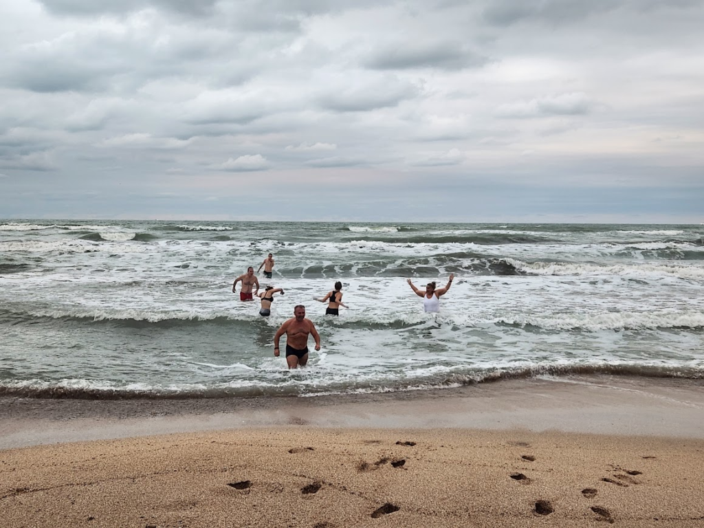Visszafelé egy kis kerülővel, Mardakan irányába, a tengerpart érintésével mentünk, ugyanis a csapat fele arra vágyott, hogy megmártsa magát a 16 fokos vízben, és ehhez az őrülethez még ketten csatlakoztak is. Ráadásul aznap éppen nem volt jó idő és már a nap is lemenőben volt. Én fényképezést vállaltam, mert valakinek meg kellett örökíteni az eseményt, nem igaz? 😃 Tovább tartott levetkőzniük és visszaöltözni, mint amennyi időt a vízben töltöttek. Hahaha 😂