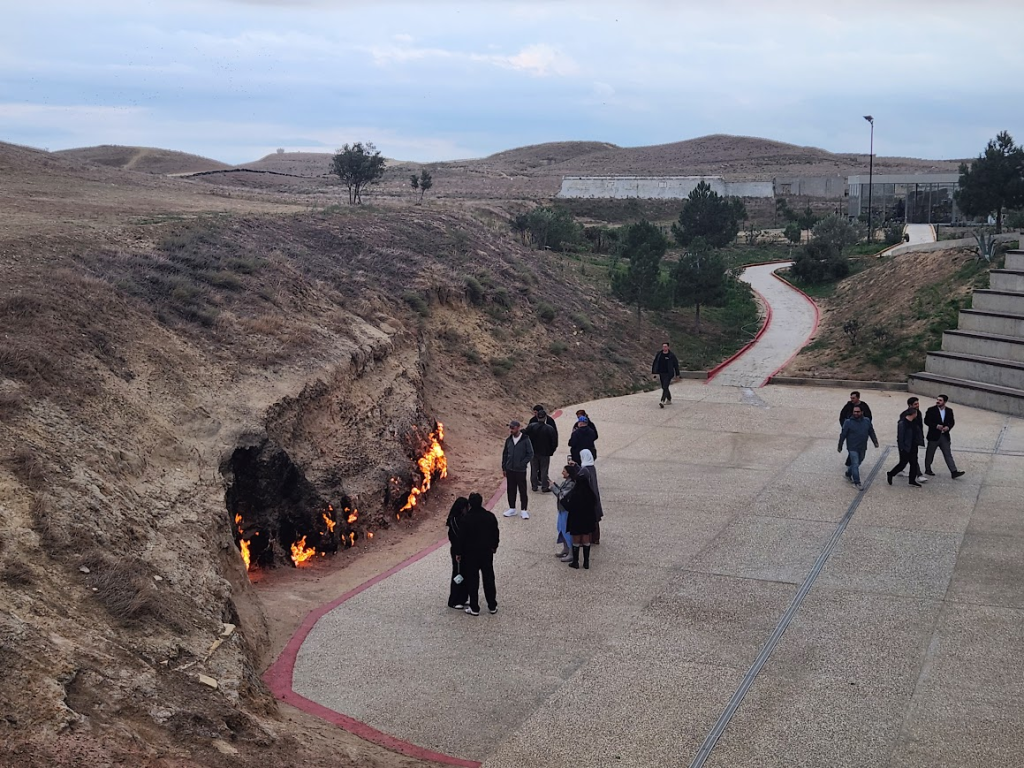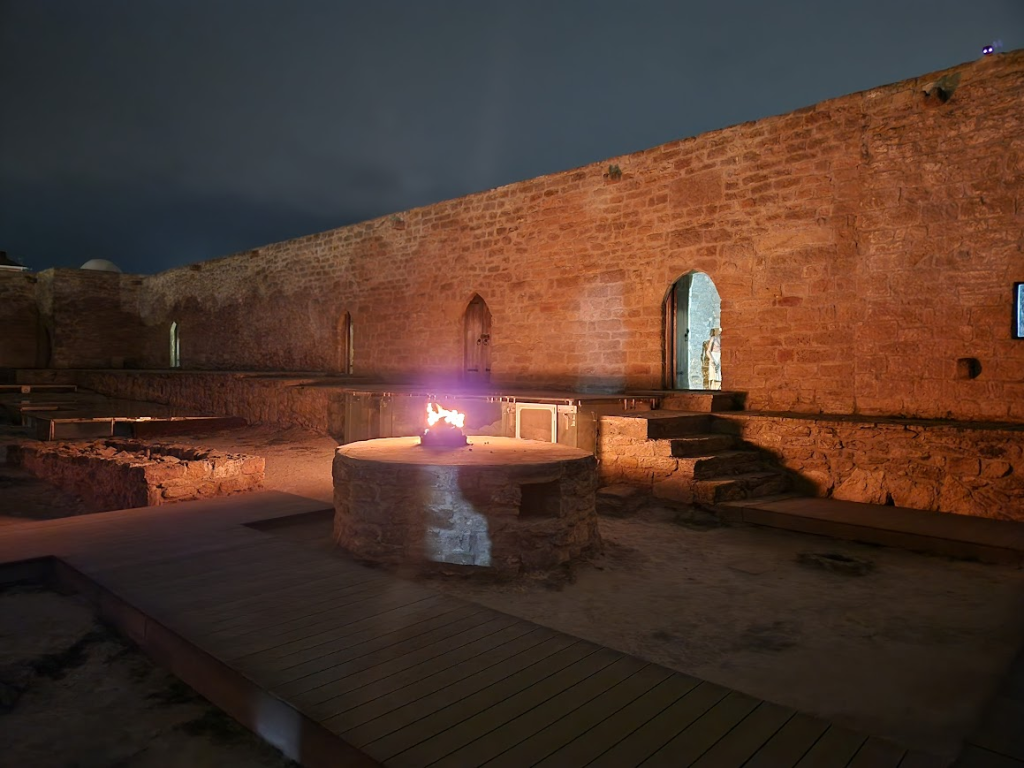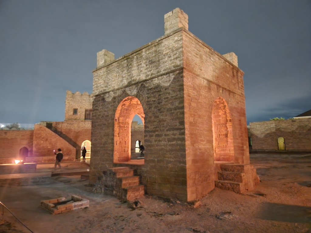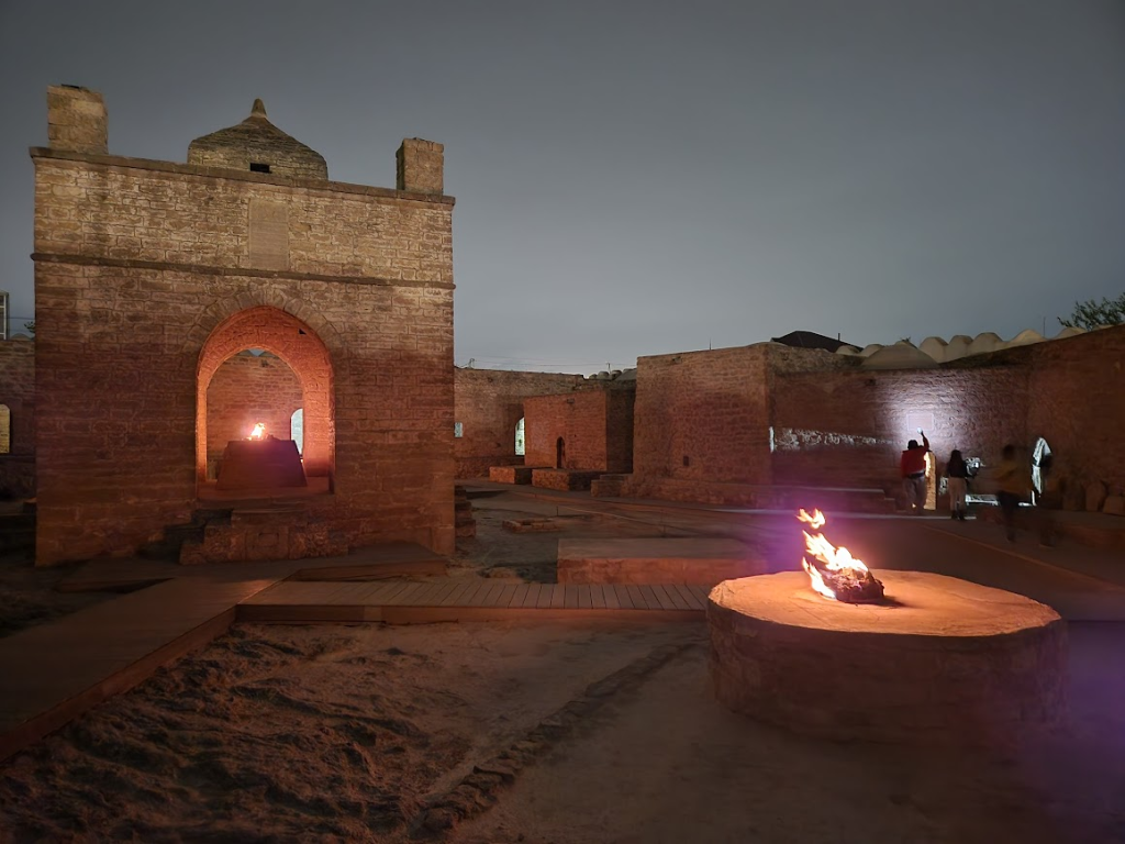 A Tűztemplomhoz (Ateshgah) már sötétben értünk, de így még különlegesebb hangulatot árasztott a hely. A Tűztemplom egy ősi zoroasztriánus (hallottál már róla?) és hindu tűzszentély, amelyet a 17–18. században használtak. Középen egy örök tűz égett, amelyet szintén a föld alól szivárgó gáz táplált. Ma múzeumként működik, és a régió tűzkultuszának egyik legfontosabb emléke.