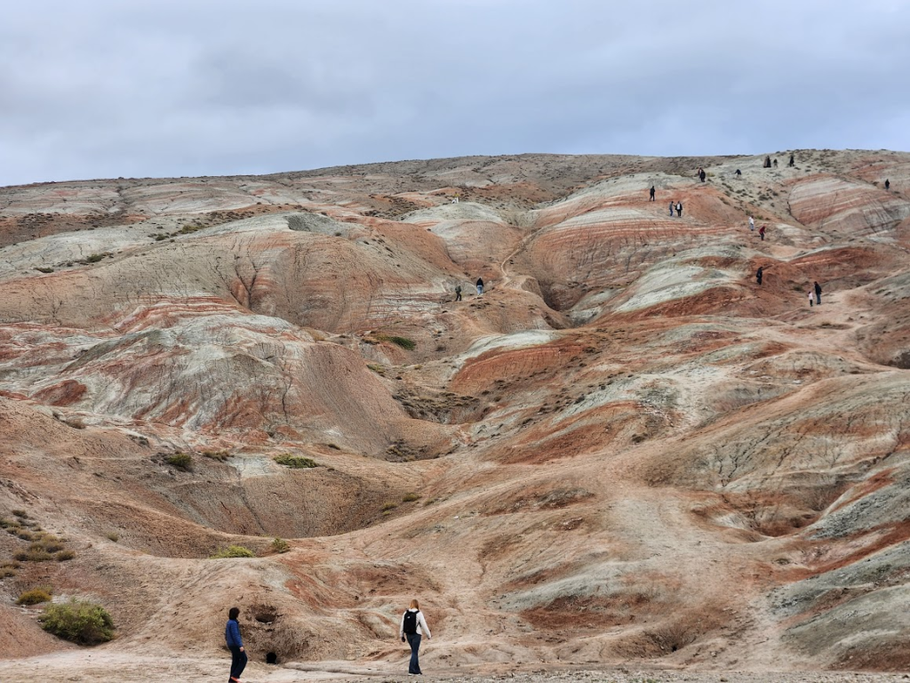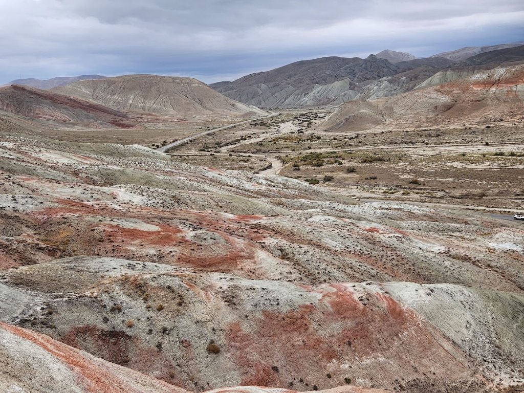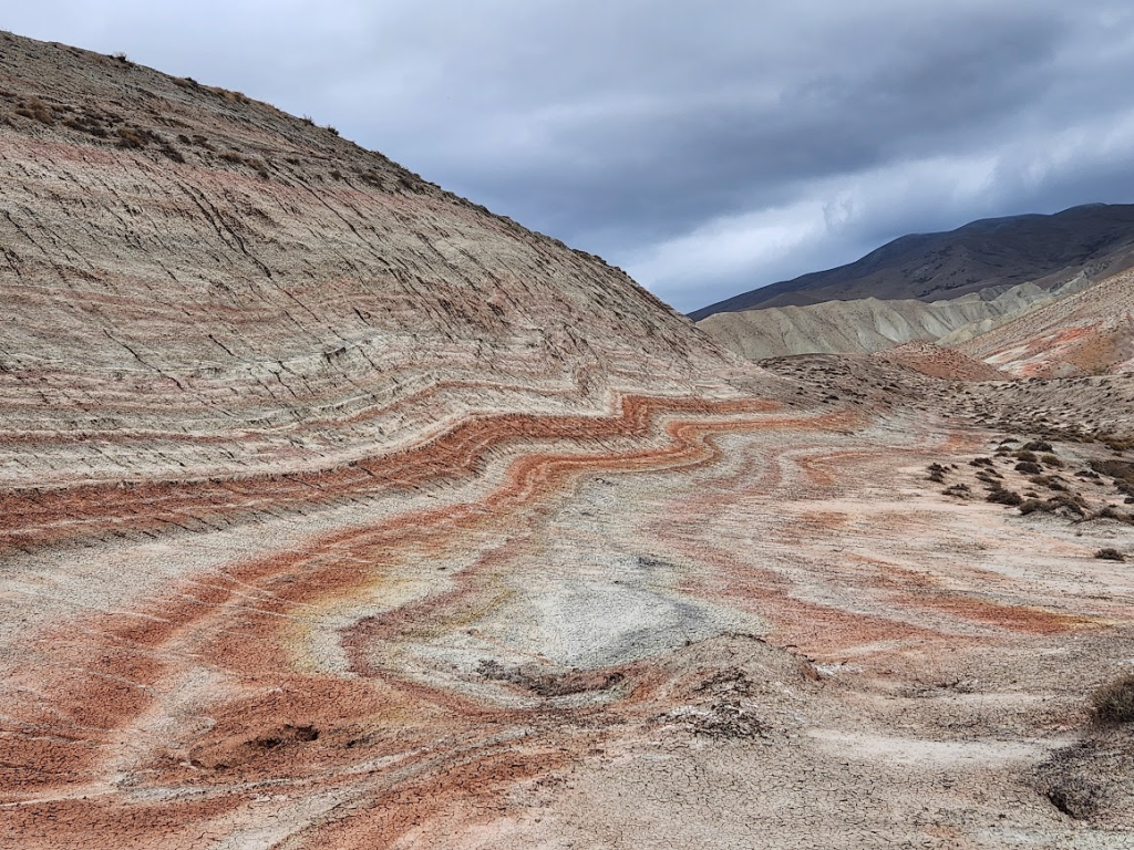 A Cukor hegyhez kicsit többet kellett utazni, 1 óra 15 perc múlva pillantottuk meg a csíkos domborulatokat. Eltéveszteni sem lehetett, nem csak a látvány miatt, hanem a parkoló autók és a hegyet meghódító turisták miatt. Lehet, hogy egyébként eszünkbe sem jutott volna megmászni, de így teljesen más élmény volt, hogy nem csak vizuálisan élveztük, hanem meg is tapintottuk a kőzetet. Meglepően puha és könnyen töredezik. Na de mitől csíkos? A Candy Cane Mountain üledékes kőzetekből (agyagkőből, márgából, mészkőből) épül fel, amelyek különböző időszakokban rakódtak le.