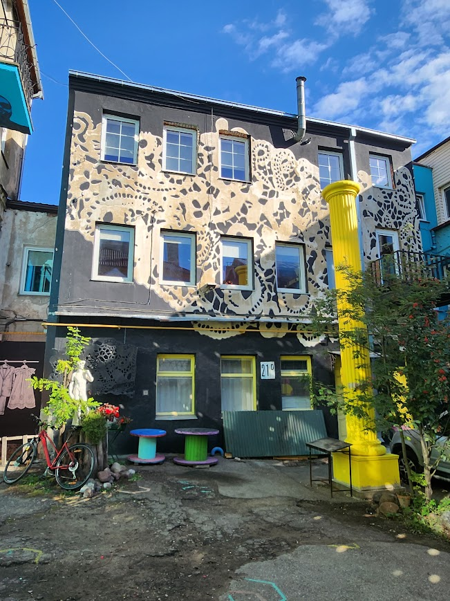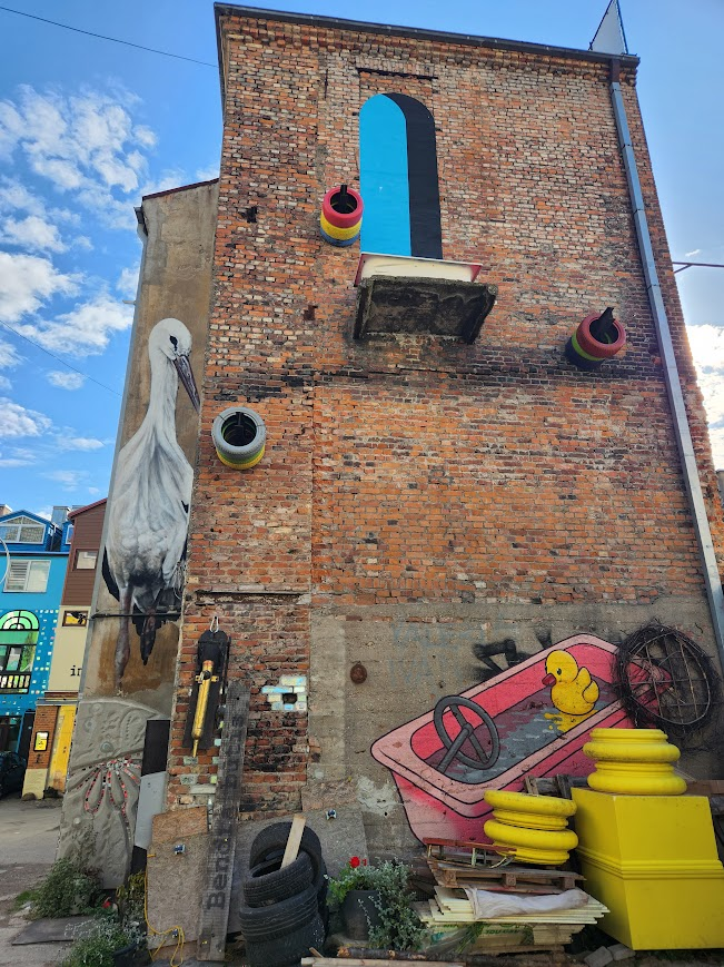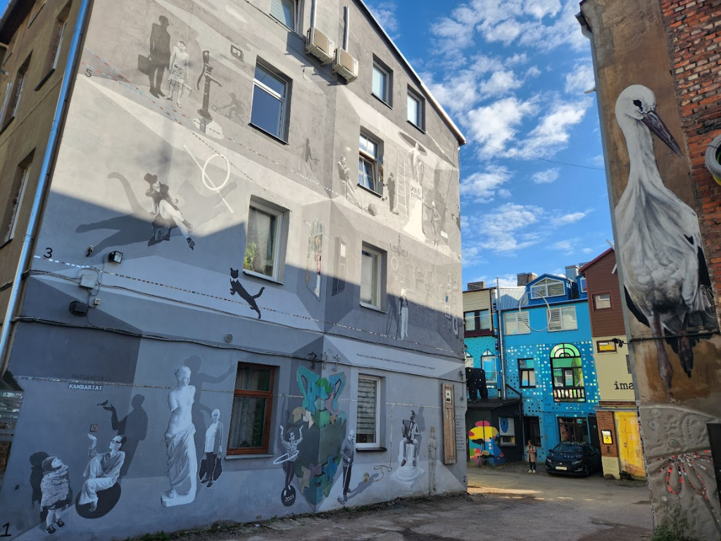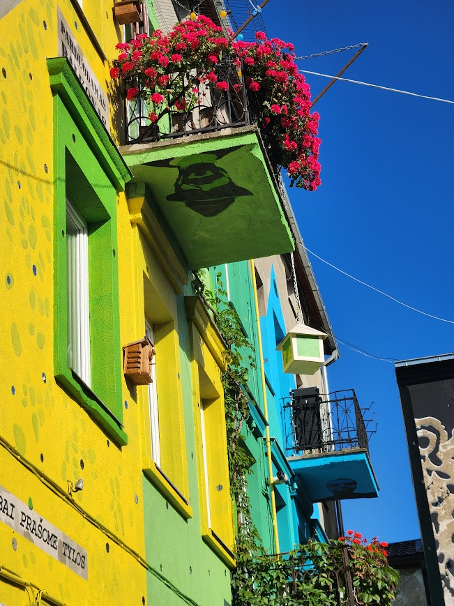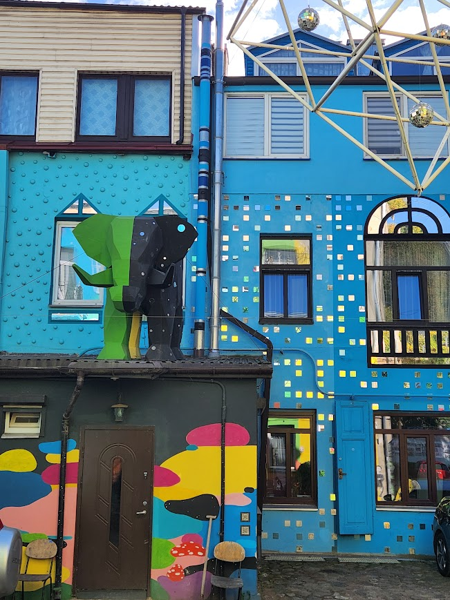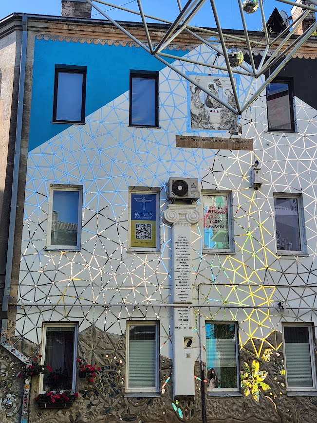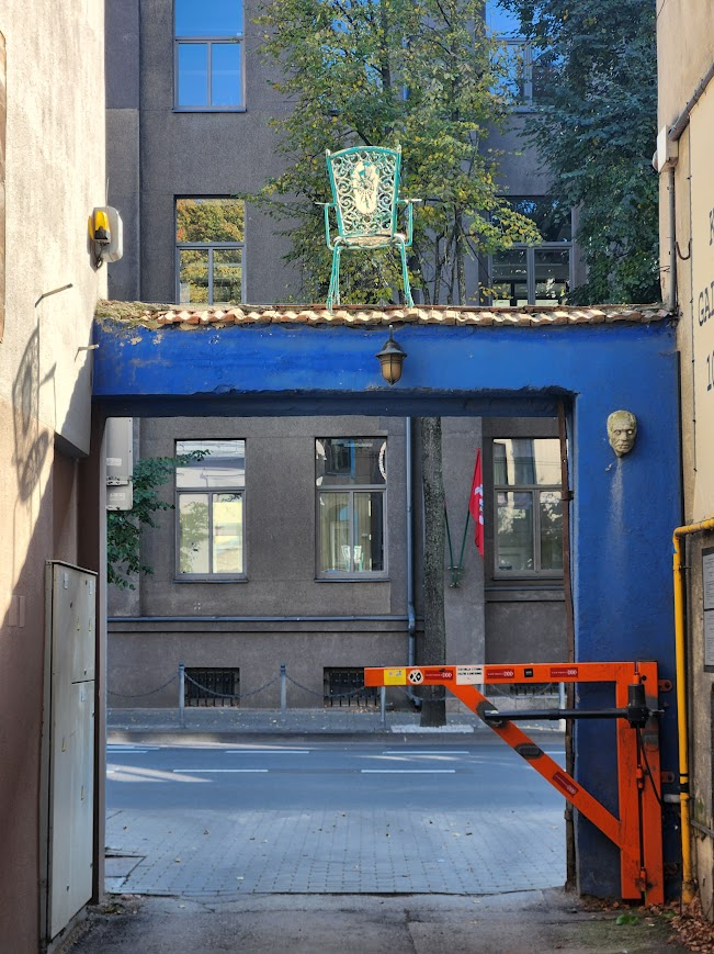 A Város tele van művészeti alkotásokkal, az ún. Yard Gallery-ra (udvari galéria) mi is kíváncsiak voltunk. Jó 20 perces séta távolságra található a nyitott galéria a Kaunasi vártól. Kívülről nem sok minden árulkodik a színes udvarról, hacsak észre nem veszi valaki a kapu feletti széket, mint nem odaillő tárgyat.