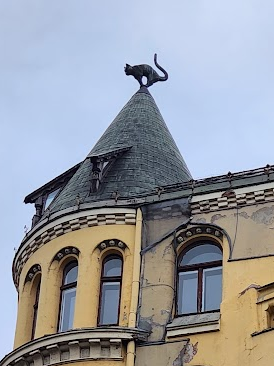 Nem különösebb érdekes a képen látható épület, hacsak fel nem nézünk a tetejére és észre nem vesszük a kupola tetején álló macskát. Egy városi legenda fűződik hozzá: a történet szerint a ház tulajdonosa egy gazdag kereskedő volt, akit nem engedtek be a közeli Kereskedők Céhébe. Mérgében a háza tetejére tette a két macskát, de szándékosan úgy fordítva, hogy azok a céhház felé mutassák a feneküket. 😼 Ez persze nem tetszett a céhmestereknek, és hosszú pereskedés lett belőle. Végül kibékültek, a kereskedőt felvették a céhbe és a macskákat is „megfordították” normális irányba. 😄