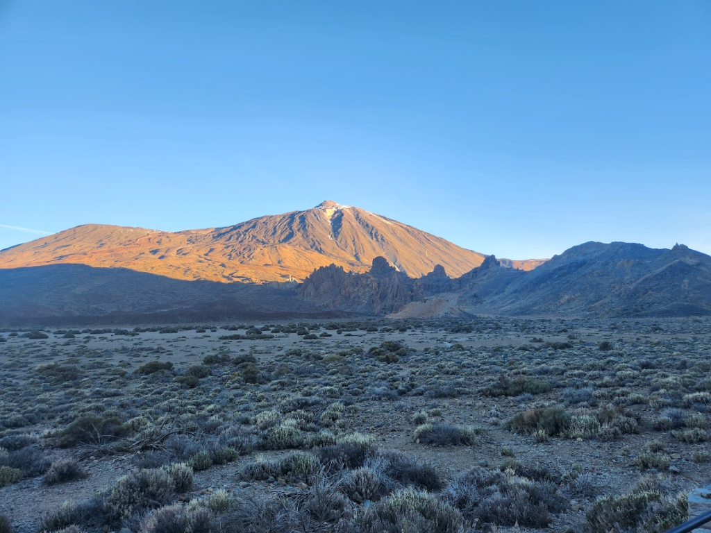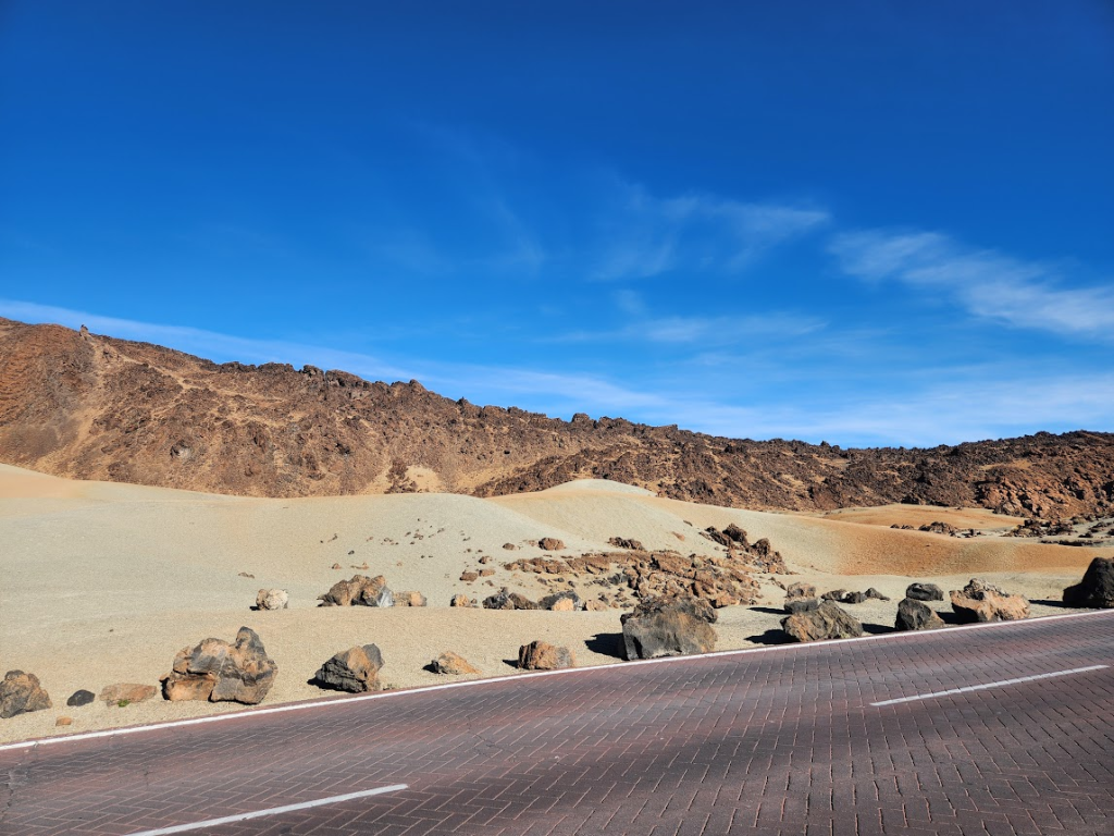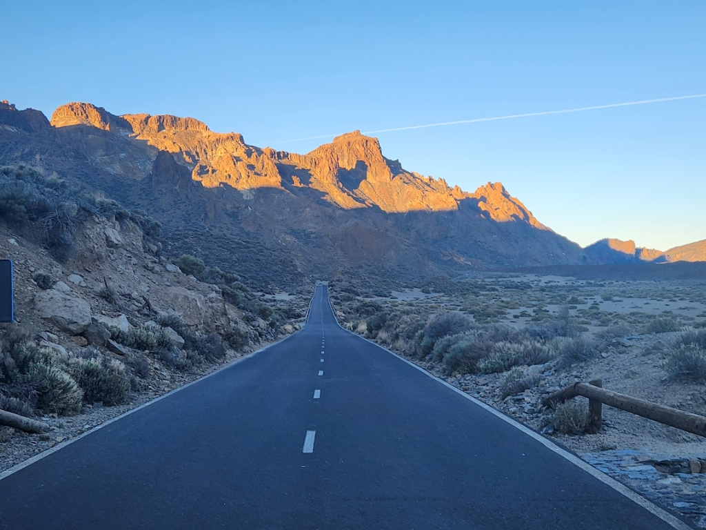 Elhagyva az autópályát és településeket, először vékony, magas törzsű fenyő erdőn keresztül vezetett az út, majd ezek a fák is eltűntek és csak kopasz sziklák szegélyezték utunkat. Jó darabig kanyargós szerpentines úton haladtunk felfelé, majd ahogy rátértünk a TF-21-es számú útra, hosszú egyenes szakaszok következtek a felvonó parkolójáig.
